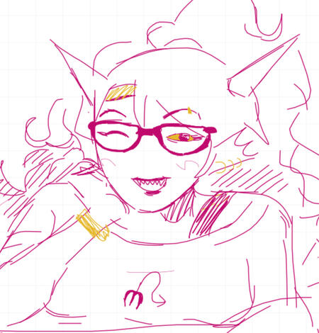 info first up is Meezni Prowis! a simple-minded fuchsia blood, Meezni was raised extremely sheltered since she was young. this had caused Meezni to be extremely oblivious to the treatment many low bloods faced, and how high bloods treated them cruelly. Often times, she would make insensitive remarks about low bloods without realizing how rude she was being. Which causes her to be seen as an asshole by most of her peers, which led to her being outcasted by them and isolating herself. Due to this isolation, she became attached to her matespirit — Sullar Litipe — as he was one of the few who remained by her side. Her classpect is a Maid of Heart, and she is a derse dreamer. Her weapon of choice is the harpoonkind. Some fun facts about her is that she wears gold mainly to match her matespirit, is a fan of troll Britney Spears, and she collects seashells.